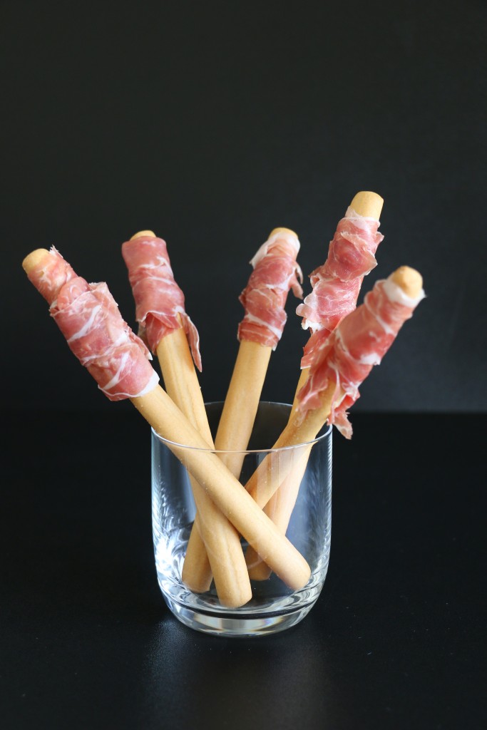 Leckere Grissini-Stangen umwickelt mit feinem Prosciutto Crudo.