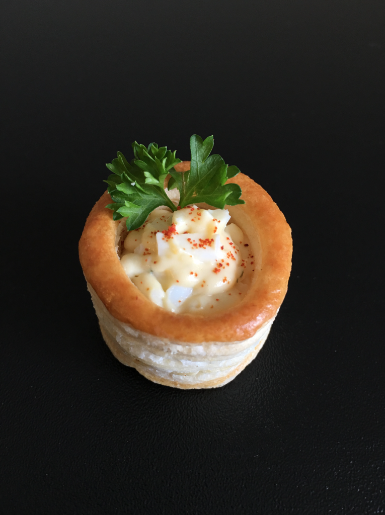 Die Mini-Pastetli werden mit kleingehackten Eiern an einem Mayonnaisedressing gefüllt und mit Gewürzen verfeinert.