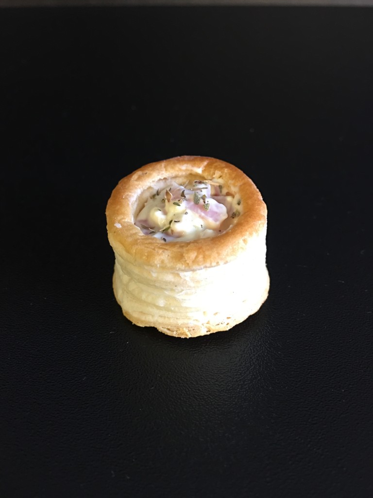 Mini-Pastetli gefüllt mit kleingehackten Schinken, Quark und diversen Gewürzen.