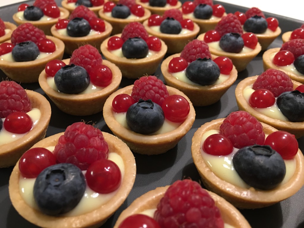 Mini-Tartelette mit frischen Beeren gebettet auf feiner Vanillecrème. (saisonal)